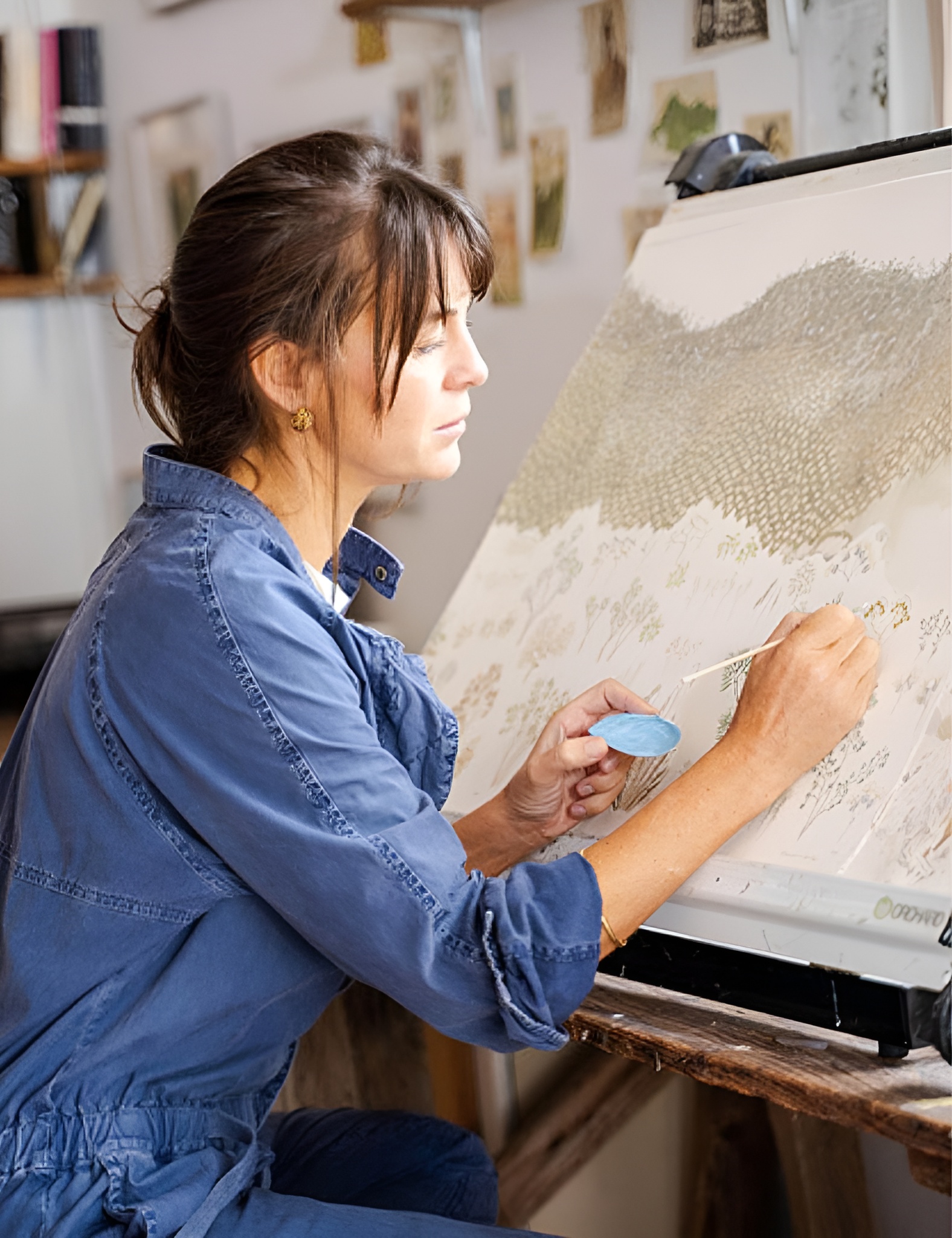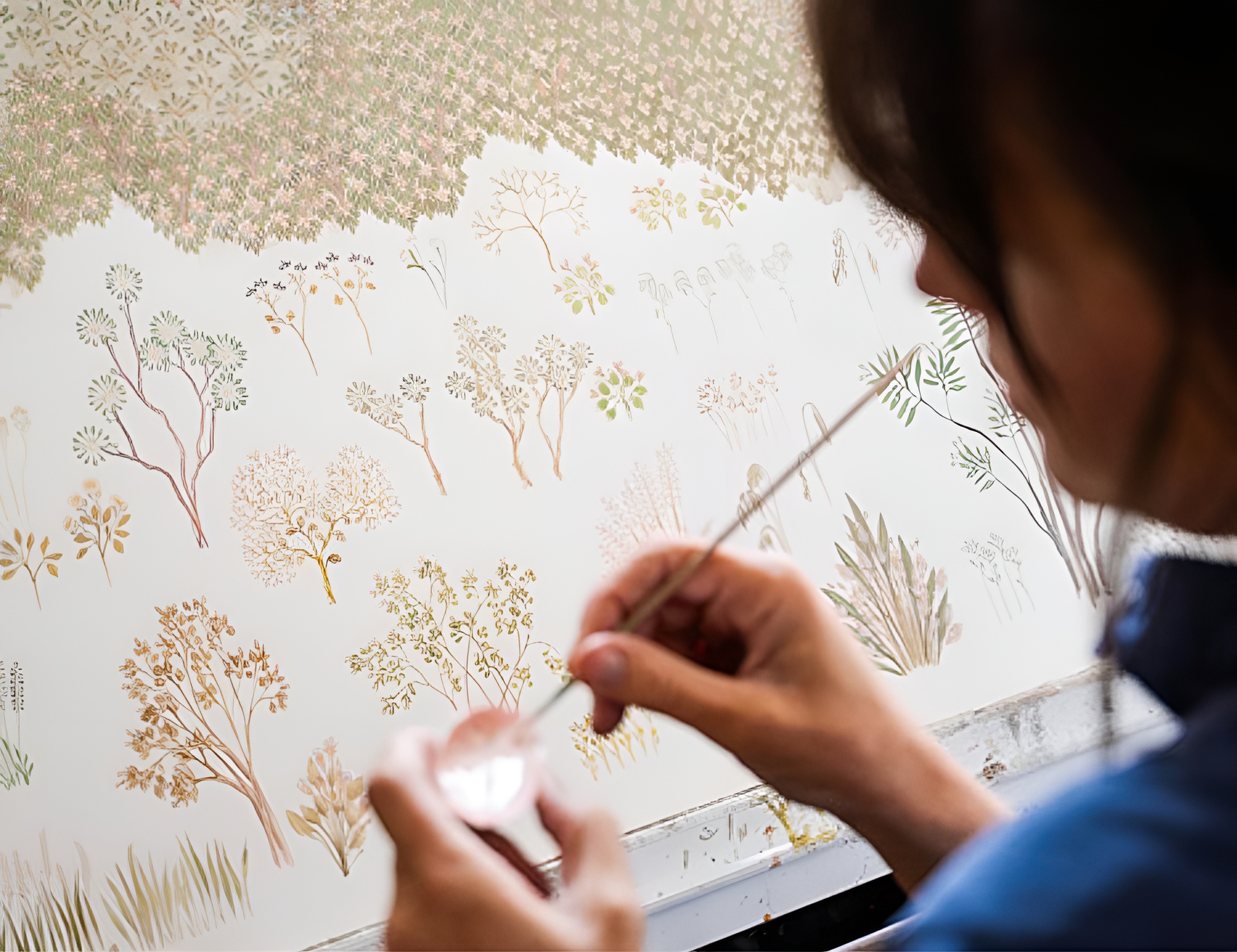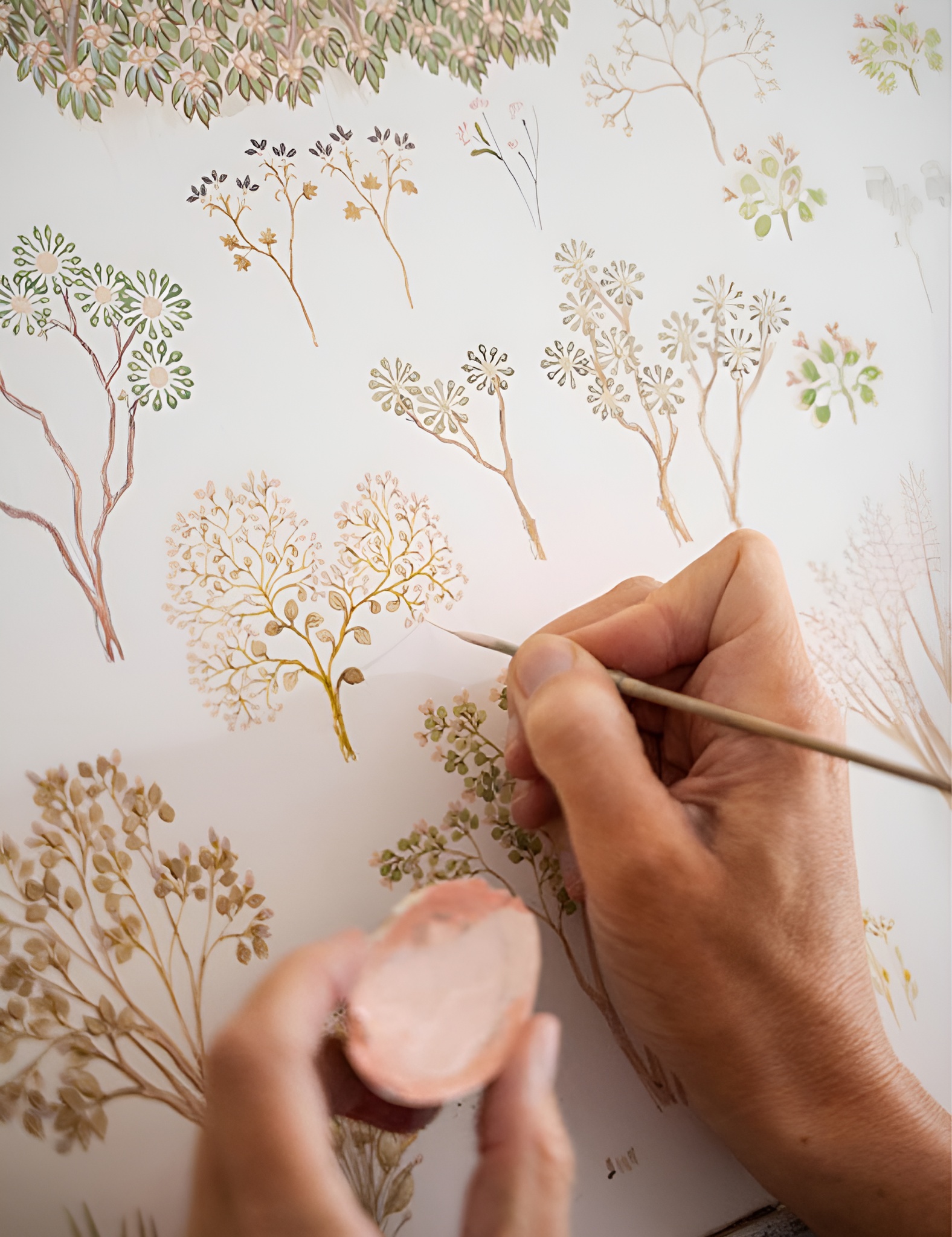 Charlie, an artist who’s received the training of Indian Miniature painting under the tutelage of Heraa Khan in Pakistan, who’s worked as an Official War Artist in Afghanistan, who’s studied Palekh icon painting in Russia under Vladimir Bushkov, brings a singular mix of experience to this exclusive Zoffany commission: to create a wallcovering for the SS25 collection.