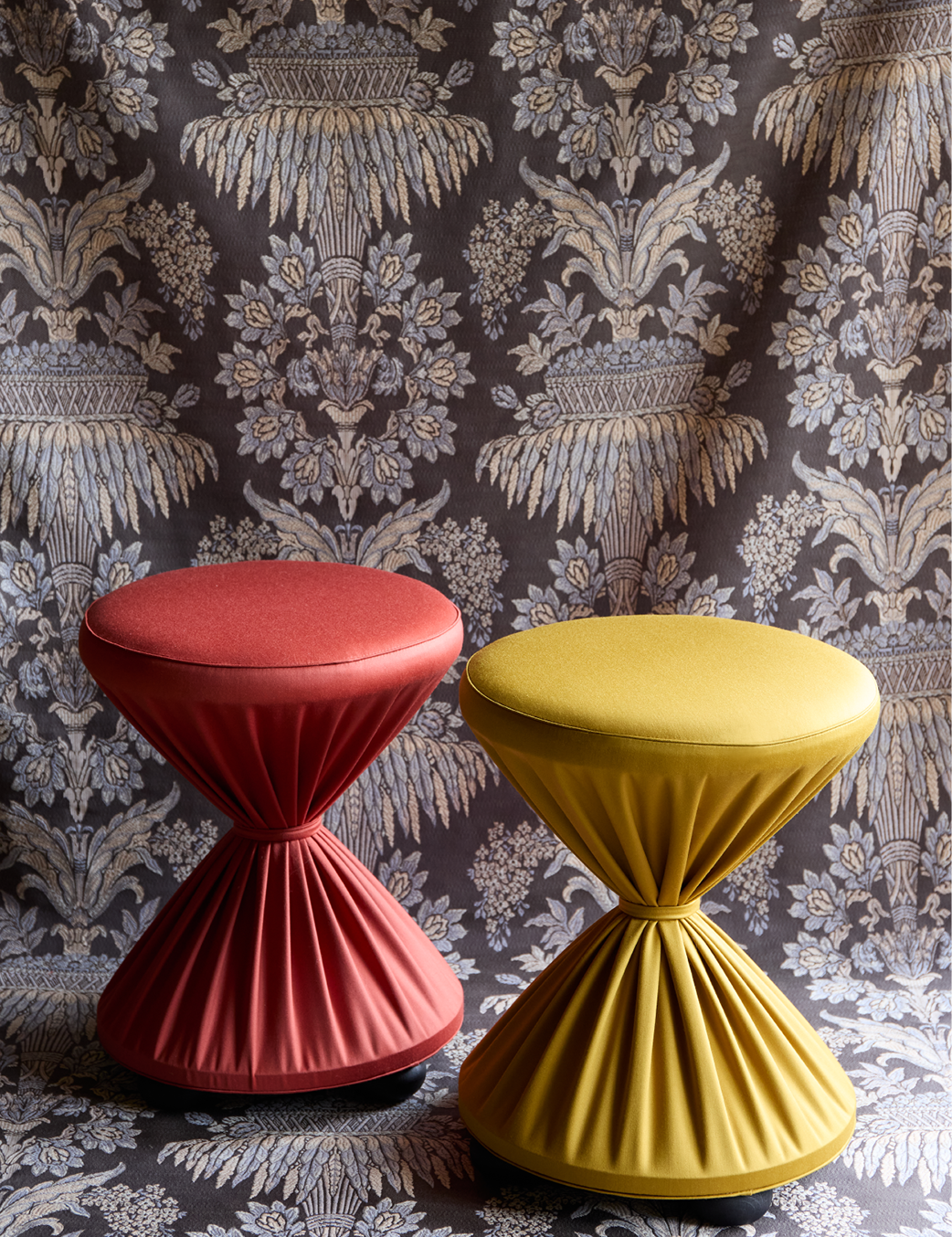 Benedict says, “This room places Zoffany’s product front and centre, highlighting its contributions to UK manufacturing while celebrating the craftsmanship of the fabric mills. With a focus on material integrity and historical research, my work draws inspiration from various visual arts references, weaving them together with a touch of humour. My work is detailed and source based but ultimately it’s about the viewer’s enjoyment!”